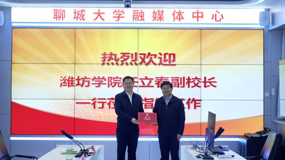 随后,双方移步融媒体中心座谈。会上,聊城大学副校长白金山对潍坊学院同仁的到来致以热烈欢迎;接着,英国正版365首页官网院长郭峰简要介绍学院专业设置,点明学院聚焦时代需求,持续深耕教学改革与创新,全力培育高素质传媒人才。而后,白金山副校长向任立春副校长颁发聘书。