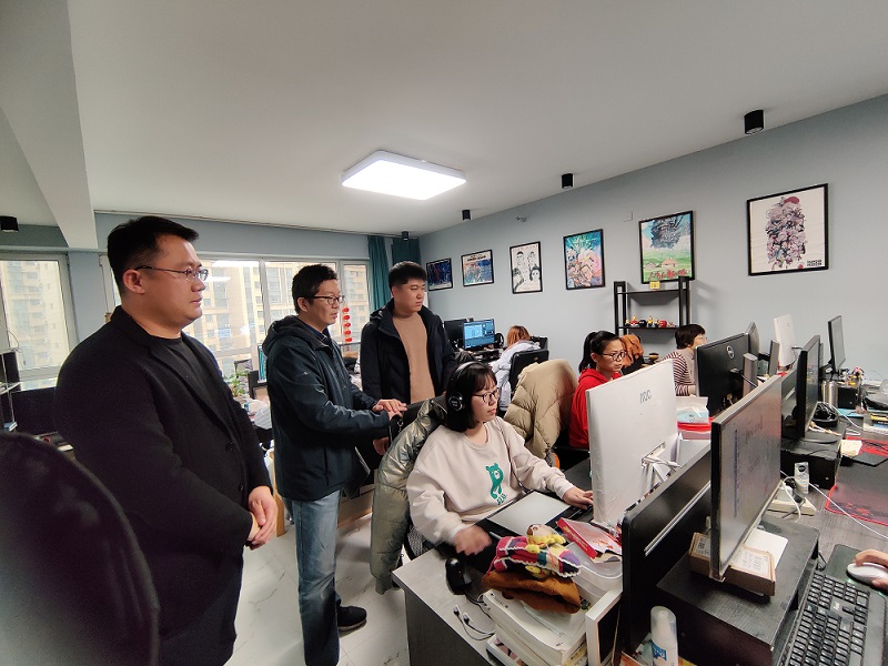2月24日,郝翰与陈浩然作为学院代表来到山东省放牛班文化传媒有限公司看望实习学生刘鑫与冯文慧。老师对两位同学的工作情况进行了详细了解,刘鑫、冯文慧两位同学依次分享自己担任动画师一职的收获与感悟。实习单位领导表示,实习学生专业基础扎实,实践应用能力较强,能够积极开展实习工作,并对进一步打通拓展校企合作道路表示期待和肯定。